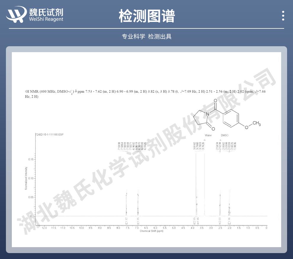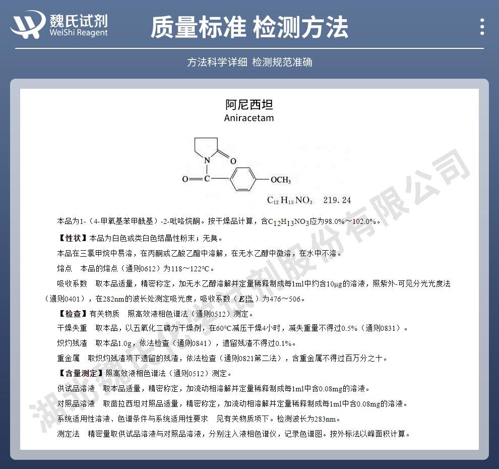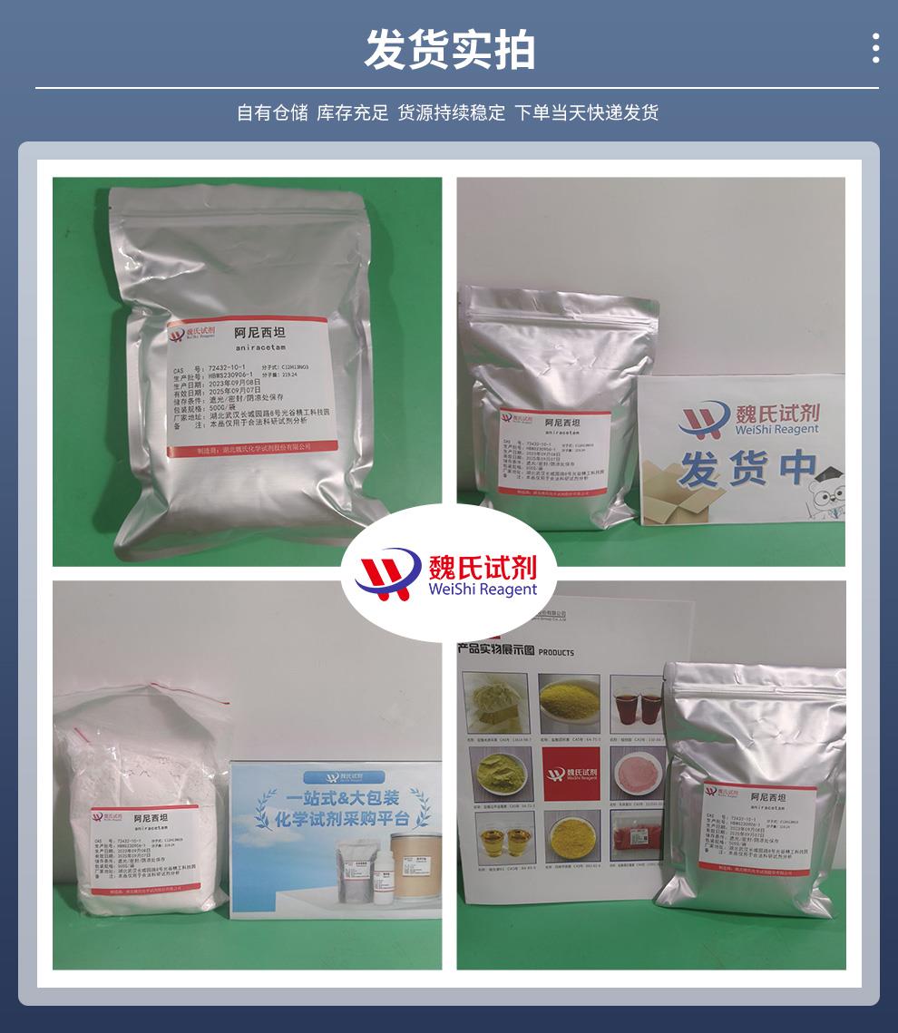 阿尼西坦—72432-10-1 湖北魏氏化学专注打造阿尼西坦科研试剂现货供应商 随货提供质检单、检测方法和检测图谱等技术资料 产品名 阿尼西坦 英文名 Aniracetam CAS 号 72432-10-1 分子式 C12H13NO3 分子量219.2365 外观:为白色或类白色结晶性粉末 含量: 98.0~102.0% 专业科学准确检测 作用: 用于外贸出口、科学研究和化学试剂等领域 包装: 25kg/纸板桶 储存:遮光干燥密封保存,有效期2年